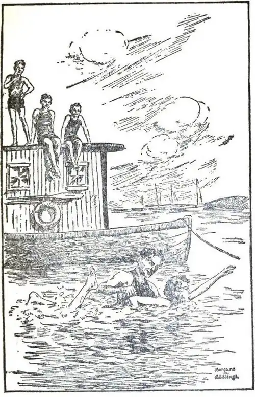 You can bet that kid is going to have the swimming badge all right, we all said; the trouble is going to be to hold him back. And we were right, too, because when he came up on the cabin roof to get dry, all of a sudden, before any of us knew it, he was over at the edge and dived off before Mr. Ellsworth had a chance to call to him. That was sure too much of a dive for a beginner, for if he hit the water face down and flat, good night, that might have been the end of him. The skiff was hauled up then so Hunt Ward dived in after him, but he had to swim some to catch him and it was mighty funny to see them.