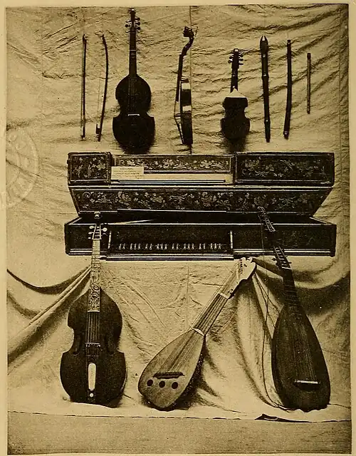 1. Bass Viol, or Viol de Gamba, or Division Viol. Italian, 1600. Carved head, inlaid fingerboard, carved and inlaid tailpiece. 6 strings, 7 frets.