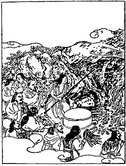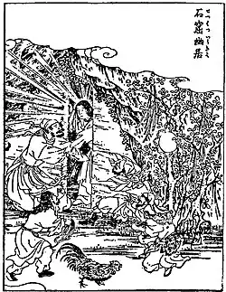 The retirement of the Sun-Goddess to the Rock-cave of Heaven produced great consternation among the heavenly deities. They met on the dry bed of the River of Heaven and took counsel how they should entice her from her seclusion. By the advice of Omohi-kane no Mikoto (the Thought-combiner or Counsellor deity) the long-singing birds of the Eternal Land (cocks)[26] were made to utter their prolonged cry before the door of the cave. Ame no Koyane no Mikoto, ancestor of the Nakatomi and Futo-dama no Mikoto, ancestor of the Imbe, dug up by the roots a five-hundred branched true Sakaki tree of Heaven and hung on its higher branches strings of jewels, on its middle branches a mirror, and on its lower branches pieces of cloth. Then they recited their liturgy in her honour. Moreover, Ame no Uzume (the Dread Female of Heaven) arrayed herself in a fantastic manner, kindled a fire and standing on a tub which resounded when she stamped upon it, performed a (not very decent) mimic dance and gave forth an inspired utterance. The Plain of High Heaven shook, and the eight hundred myriad deities laughed together. The Sun-Goddess wondered how Ame no Uzume and the other gods could be so jolly while the world was wrapped in complete darkness, and peeped out from the half-opened door of the cave. She was at once seized by Ta-jikara no wo (Hand-strength-male) and prevented by main force from re-entering, to the great joy of all the deities.