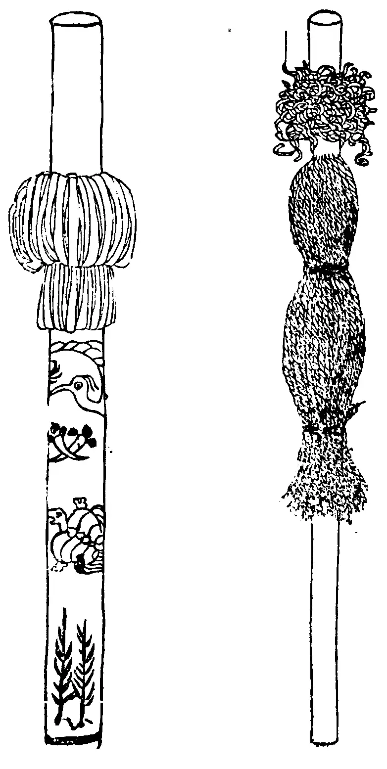 The Japanese novelist and antiquary Kiōden, writing about a century ago, informs us that a similar custom was at that time still practised in the province of Echigo. He gives a drawing of the sticks used for the purpose, of the phallic character of which there can be no doubt. They were called kedzurikake (part-shaved), and consisted of wands whittled near the top into a mass of adherent shavings, as in the illustration.