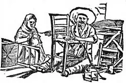 A peep into doorways shows the people at all manner of occupations. Men always use the machines. Women and men put chairs together and weave bottoms in them.