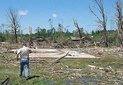 Slab wiped clean with only anchor bolts protruding from perimeter of slab. One fatality and two serious injuries at this location. Hardwood tree in background debarked. Rich Okulski, Warning coordination Meteorologist (WFO Memphis) surveying damage. Photo location one mile west of Smithville, MS. (Photo: WFO Memphis)
