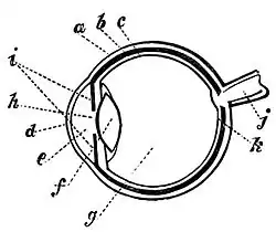 The annexed diagram (Fig. 1) of a horizontal section of this organ will give a better idea of its general structure than whole pages of letter-press. It will be seen to consist of a globe of three envelopes or coats, which are kept distended by three transparent humours or lenses: the aqueous (c), the crystaline (f), and the vitreous (g). The outer coat (a) is dense, white, and fibrous. In front of the eye it gives place to a perfectly transparent one, called the cornea (d). The next coat, the choroid (b), is vascular, very black on its internal surface, in order that light falling on it through the pupil (h) may not be reflected. The pupil is an opening through a diaphragm which is called the iris (i), from its colour varying in different individuals. It has the power of expanding and contracting the pupil, for the purpose of regulating the supply of light to the retina (c), or third and last coat which lies immediately on the choroid. It is transparent, very complex, and the only part of the eye we shall carefully consider.
