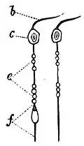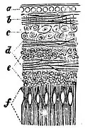 The following diagram (Fig. 2) represents a section of it magnified 250 diameters, a is called the limitary membrane, and forms its innermost surface, or that which is next the vitreous humour; b consists of the layer of optic nerve fibres; c is a layer of grey nerve cells; d, two layers in which the principal retinal blood-vessels are spread out; c, two layers of granular matter; f Jacob's membrane, or layer of rods and cones. Fig. 3 will give some idea of the supposed connexion between these various parts, the same letters referring to the same parts as in Fig. 2.