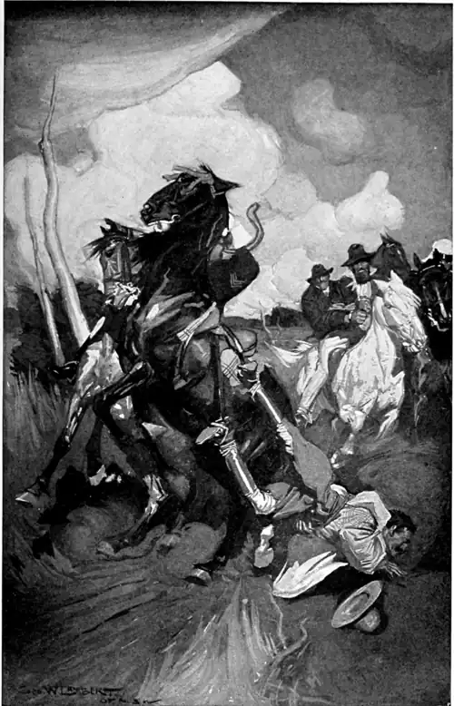 Sergeant Cameron was driving the spring-cart, toward sundown, after a variety of unforeseen delays. Of a sudden out of the pink haze came a galloping figure, slightly humped, in the inspector's coat and wideawake, with a bare foot through one stirrup and only a sock on its fellow.