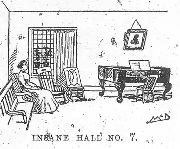 Hall 7 looks rather nice to a casual visitor. It is hung with cheap pictures and has a piano, which is presided over by Miss Mattie Morgan, who formerly was in a music store in this city. She has been in the asylum for three years. Miss Mattie has been training several of the patients to sing, with some show of success. The artiste of the hall is Under, pronounced Wanda, a Polish girl. She is a gifted pianist when she chooses to display her ability. The most difficult music she reads at a glance, and her touch and expression are perfect.