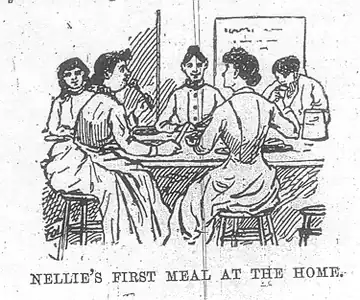 When the supper-bell rang I went along with the others to the basement and partook of the evening meal, which was similar to dinner, except that there was a smaller bill of fare and more people, the women who are employed outside during the day having returned. After the evening meal we all adjourned to the parlors, where all sat, or stood, as there were not chairs enough to go round.