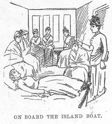 The boat stopped and the old woman and the sick girl were taken off. The rest of us were told to sit still. At the next stop my companions were taken off, one at a time. I was last, and it seemed to require a man and a woman to lead me up the plank to reach the shore. An ambulance was standing there, and in it were the four other patients.