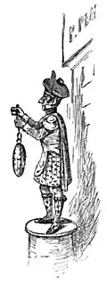 Now, what the Admiral was staring at was a mystery. He might, for instance, have been looking at the wooden Highlander that stood at the door of Mr. Pendle’s instrument-shop, for nothing more magnificent than this particular Highlander could possibly be imagined. His clothes were of every color of the rainbow, and he had silver buckles on his shoes, and brass buttons on his coat, and he was varnished to such an extent that you could hardly look at him without winking. Then his hair and his whiskers were so red, and his legs were so pink and so fat and so lifelike, that it seemed as if you could almost hear him speak; and, what was more, he had been standing for years at the door of the shop, proudly holding up a preposterous wooden watch that gave half-past three as the correct time at all hours of the day and night. In fact, it would have been no great wonder if the Admiral had stared at him to the end of his days.