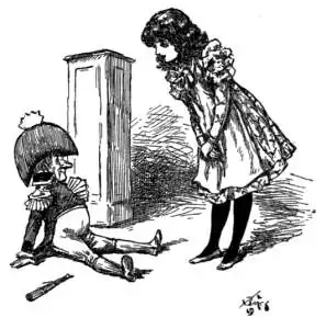 Well, all these good old-fashioned things came to pass on this particular Christmas eve except the snow; and in place of that there came a soft, warm rain which was all very well in its way, except that, as Dorothy said, “It didn’t belong on Christmas eve.” And just at nightfall she went out into the porch to smell the rain, and to see how Christmas matters generally were getting on in the wet; and she was watching the people hurrying by, and trying to fancy what was in the mysterious-looking parcels they were carrying so carefully under their umbrellas, when she suddenly noticed that the toes of the Admiral’s shoes were turned sideways on his pedestal, and looking up at him she saw that he had tucked his spy-glass under his arm, and was gazing down backward at his legs with an air of great concern.