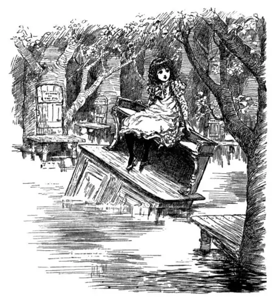 “If Mrs. Peevy’s umbrella shuts up with them inside of it,” she said mournfully to herself, “I’m sure I don’t know what they’ll do. It’s such a stiff thing to open that it must be perfectly awful when it shuts up all of a sudden,” and she was just giving a little shudder at the mere thought of such a thing, when the sideboard bumped up against something and she found that it had run into a tree. In fact, she found that she had drifted into a forest of enormous trees, growing in a most remarkable manner straight up out of the lake; and as she looked up she could see great branches stretching out in every direction far above her head, all interlaced together and covered with leaves as if it had been midsummer instead of being, as it certainly was, Christmas day.