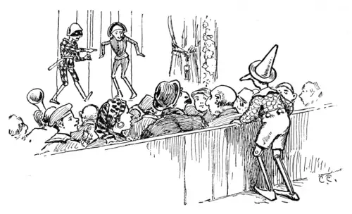 At this affecting invitation Pinocchio made a jump, and from the back part of the theater he went to the reserved portion; then with another jump from the reserved seats he mounted on the head of the orchestra leader, and from there he jumped upon the stage.