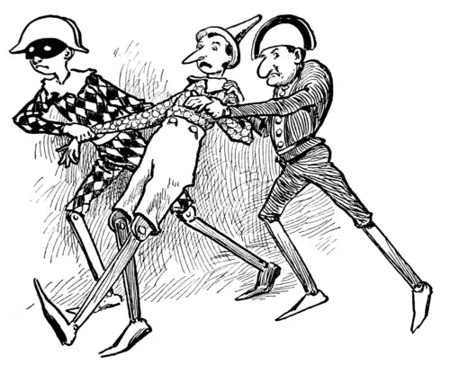 The marionettes went on with the comedy and the manager went to the kitchen where he was preparing for supper a sheep that was cooking on a spit. As he needed more wood to finish cooking it, he called Harlequin and Pulcinello, who had finished their performance, and said to them: “Bring me now the marionette that you will find tied to a nail. He appears to be made of good dry wood, and I am sure he will make a beautiful flame for a roast.”