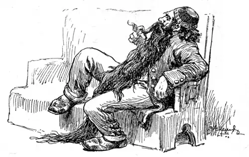 The proprietor, Fire Eater (for that was his name), looked fearful with his black beard covering his chest and legs like an apron; but he really was not a bad man. When he saw Pinocchio carried before him and crying, “I do not want to die! I do not want to die!” he began to pity him. He resisted the feeling for a little while, but when he could do so no longer he gave a terrible sneeze.