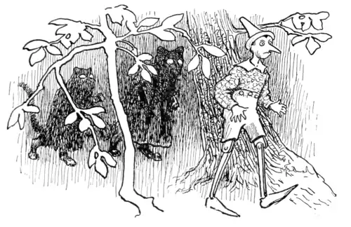 Not being able to reply on account of the money in his mouth, Pinocchio made many bows and gestures in order to make his captors understand that he was a poor marionette and that he did not have a cent in his pockets. “Come on and stop fooling! Out with it!” the brigands cried. And the marionette made signs with his hands and head, which meant, “I have none!”