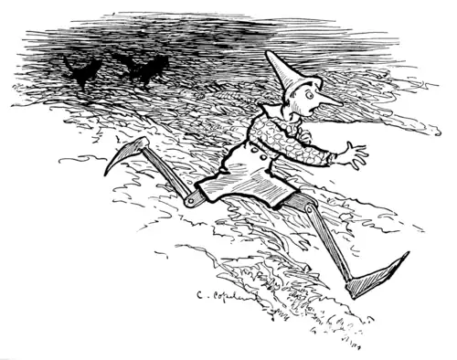 After a run of fifteen miles Pinocchio could go no farther. Seeing himself lost, he climbed to the top of a large pine tree and sat on the branches. The assassins also tried to climb; but when they got halfway up they slipped and fell to the ground, rubbing the skin off their legs and hands as they dropped.