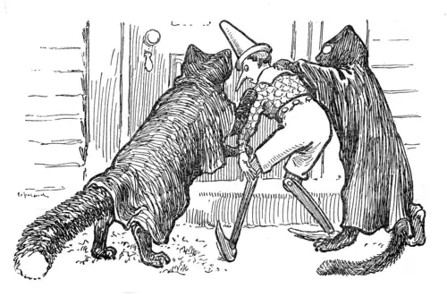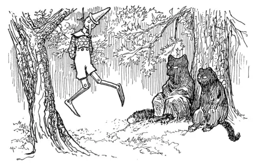 The marionette, seeing death staring him in the face, trembled; so that all his joints made a great noise and the four gold pieces jingled in his mouth.
