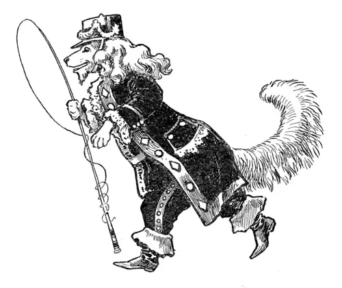 Then the Fairy clapped her hands twice and a Bearded Dog appeared, walking on his hind legs, just like a man. The Bearded Dog was dressed in livery. He had a cap trimmed with gold lace and a white curly wig that came down to his neck. He wore a dress coat of chocolate color, with buttons of brilliants and two big pockets to hold bones. He had a pair of short boots of crimson velvet and he carried behind him a sort of umbrella cover in which he put his tail when it rained.