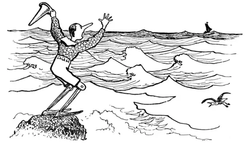 Meanwhile the little boat, tossed around by the waves, now disappeared between the billows, now floated on top. Pinocchio, standing on a point of a high reef, called his papa by name and made many signals with his arms and finally with the