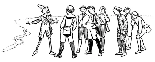 They had already reached the city and were just on the point of entering when a gust of wind blew off Pinocchio’s hat and carried it along the road back of them.