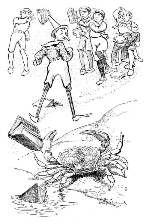 Poor Crab! It was as if he had spoken to the wind. That scoundrel, Pinocchio, turned around and said most impolitely: “Oh, hush! ugly Crab. You would do better to eat some seaweed and cure that cold of yours. Go home to bed and take a good sweat.”