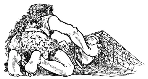Having taken this resolution he approached the reef; but when he was about to land he felt something in the water that drew him along. He tried to escape but it was too late. He found himself in a great fish net full of fishes of every kind. And then he saw coming out of the grotto a fisherman so ugly that he appeared to be a sea monster. Instead of hair he had bunches of seaweed on his head. His skin also was green; so were his eyes and his long beard. He looked like a great big lizard with arms and legs.