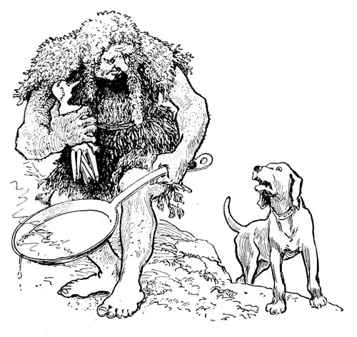 Just as the fisherman was on the point of putting Pinocchio into the frying pan a big Dog entered the grotto, having been attracted by the savory odor of the fried fish. “Go away!” cried the fisherman, waving in his hand the marionette all covered with flour. But the poor Dog had a hunger that demanded to be appeased. So, whining and wagging his tail, he appeared to say, “Give me a mouthful of fish and I will leave.”