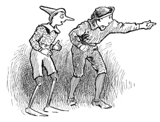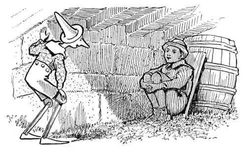 Lamp Wick was the most careless and mischievous boy in all the school, but Pinocchio liked him very much. He went to look for him so as to give him an invitation to the party next day; but he sought in vain. Where could he be? He looked here and there and finally found him under a shed of a country house.
