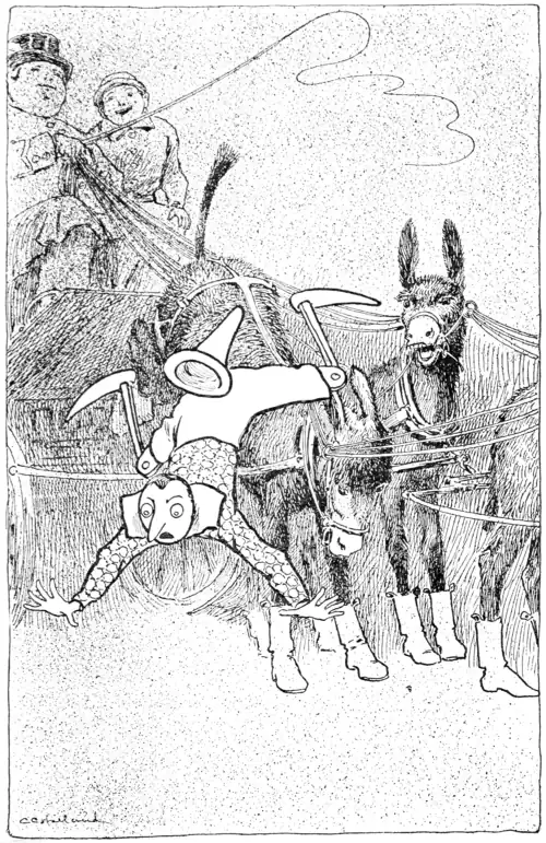When they were ready to start the donkey again raised his hind feet and gave such a strong kick that the marionette was thrown on top of a heap of gravel. The boys again laughed out loud; but the driver, instead of laughing, went to the donkey and, feigning to whisper something in his left ear, bit off a portion of that ear also. Then he said to the marionette: “Remount and have no fear. That donkey had a whim in his head, but I have spoken to him and he will be more reasonable.”