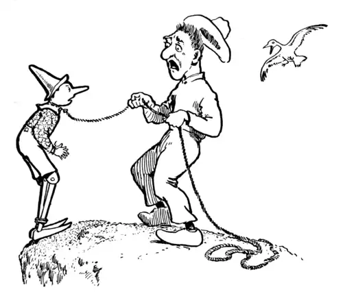 The buyer, curious to know the true story, untied the knots that bound the marionette; and then Pinocchio, finding himself as free as a bird in the air, said: “Know, then, that I was at first a wooden marionette as I am to-day. But I was on the point of becoming a boy, just like other boys, when I listened to the advice of a bad companion, and one morning I awoke and found myself turned into a donkey with big ears and a beautiful tail. What shame I felt when I saw that I had a tail! I was then led to a square where a master bought me and taught me to do tricks and dance. One night, when I was performing, I fell and sprained my leg so badly that I could hardly stand on it. Then the master, who did not know what to do with a lame donkey, sold me to you.”
