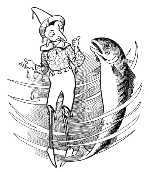 “She is my mamma, who is like all other mammas in this world. She liked me and tried to make me a good and studious boy. As soon as the good Fairy saw me in danger of drowning she sent a school of fishes, which, believing that I was really dead, began to eat me. And what mouthfuls they took! Some ate my ears; some my neck and mane; some the skin on my legs; some the hair on my back; and among them there was one big fish that ate my tail at one bite. When the fish had eaten everything they finally came to the bones,—or rather, they came to the wood. Finding that too hard for their teeth, they went away and did not even look back to say good-by.”
