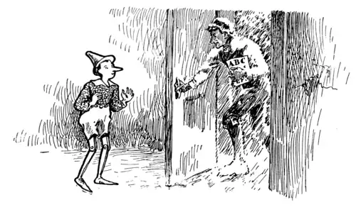 After a little while he returned with an A B C card in his hand, but his coat was gone. The poor man was in his shirt sleeves and it was snowing outside too.