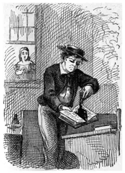 So the boy halted, wondering what he could have done for she had said she would look at pictures all through the nooning—and she walked on, crying. Then Alfred went musing into the deserted school-house. He was humiliated and angry. He easily guessed his way to the truth—the girl had simply made a convenience of him to vent her spite upon Tom Sawyer. He was far from hating Tom the less when this thought occurred to him. He wished there was some way to get that boy into trouble without much risk to himself. Tom's spelling book fell under his eye. Here was his opportunity. He gratefully opened to the lesson for the afternoon and poured ink upon the page.