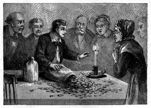 Tom entered, struggling with the weight of his sacks, and Aunt Polly did not finish her sentence. Tom poured the mass of yellow coin upon the table and said—