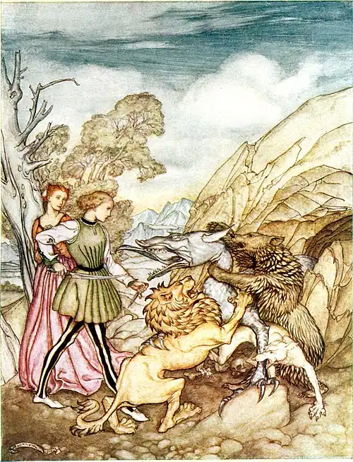 When they had finished their meal, the hermit said to Cesarino: “Not far from this place there lives a dragon whose poisonous breath destroys and annihilates everything around, nor is there found any one in the country who can withstand him, and so great is the ruin he works that before long all the peasants of the land will be forced to abandon their fields and fly elsewhere. And, over and beside this, it is necessary to send him every day the body of some human being to devour, for, failing this, he would destroy everything far and near. By a cruel and evil fate the one chosen by lot for to-morrow is the daughter of the king, who in beauty and worth and goodness excels every other maiden now alive, nor is there aught to be found in her which is not worthy of the highest praise. Of a truth, it is a foul mischance that so fair and virtuous a damsel should thus cruelly perish, and she herself all the while free of any offence.”