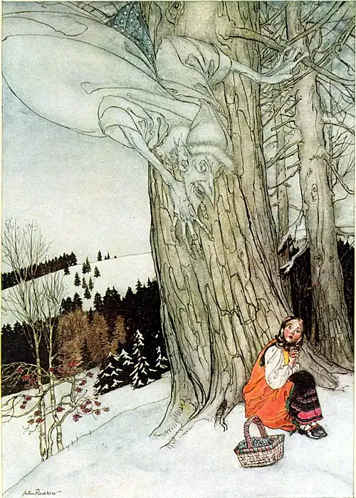 The old man silently placed the things on the sledge, made his daughter put on a warm pelisse, and set off on the journey. After a time he reached the forest, turned off from the road, and drove across the frozen snow. When he got into the depths of the forest he stopped, made his daughter get out, laid her basket under the tall pine, and said: