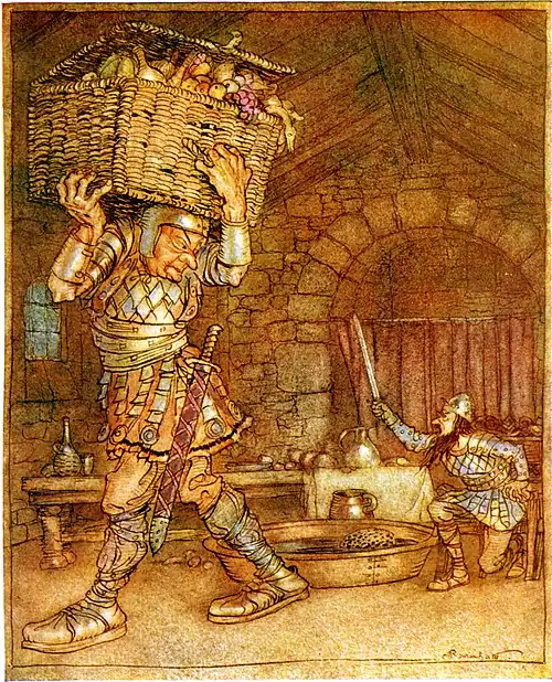 Then the giant instantly put down the hamper on the floor and awaited the king. And a fierce encounter was between them, so that the glittering fire flew out from their arms.