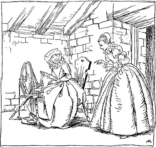 After fifteen or sixteen years, while the king and queen had gone to one of their pleasure-houses, it so fell out that the princess was playing in the castle, running through the rooms and climbing up stairway after stairway. At last she came to the very top of a turret, and found herself in a little garret, where an old woman sat all alone working with her spindle.