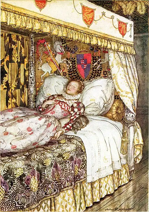 She touched with her wand every one who was in the castle except the king and queen—governesses, ladies-in - waiting, chambermaids, courtiers, officers, stewards, cooks, scullions, errand-boys, guards, beadles, pages, footmen. She touched also all the horses that were in the stables with the grooms—the big mastiffs in the stable-yard, and little “Puff,” the princess’s tiny lap-dog, who lay close to her on the bed. The very moment that she touched them they all went off to sleep also, not to wake until such time as their mistress should wake too, so that they could attend upon her when necessary. Even the spits which were turning at the fire, laden with partridges and pheasants—they went to sleep as well, and the very fire itself. The fairies did not take long over their work.