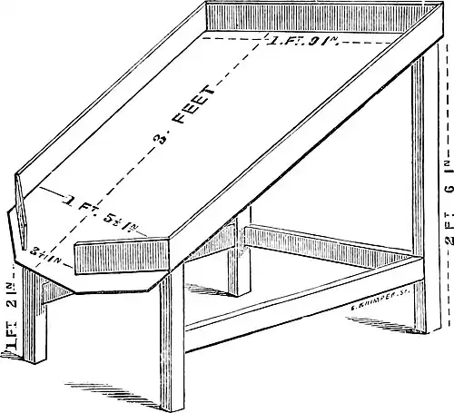 The subjoined figure of a drenching board, will suggest a simple means of economising any liquid preparation employed for cleansing plants. The plant is laid on the board, and the syringe is used with some force upon it, and a pail being placed in front, a considerable proportion of the fluid is caught for further use and none of it is conveyed to the roots. A carpenter would make such a board for ten shillings or less.