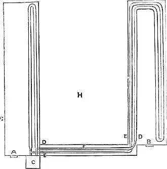 If you want the quickest possible circulation of hot water, fit a perpendicular syphon through a saucepan lid, seal the lid down waterproof and fireproof, insert a small tube at the top of the syphon, and through that tube fill the whole concern with water, and then put the saucepan on the fire. The circulation will begin instanter, and will be perfect from the first moment that accessions of heat are communicated from the fire to the water. The laws which regulate the movements of heated fluids are fully explained and illustrated in the books that treat of physics and natural philosophy, so it is not worth while to go into that part of that subject here. It only concerns us to know that in a perpendicular column of water the movements caused by heat are most decisive and complete, and that every deviation from the perpendicular tends to arrest the motion, so that when we reach the horizontal, the rate of motion is reduced to a minimum, or may absolutely cease altogether, which in a certain sense is less than a minimum, as nothing is less than the least. In the heating of these two houses we had to calculate to a great nicety how to make the most of the perpendicular space at command—to consider, in fact, how much could be done between the lowest point at which the pipes could be placed in the houses, and the highest level of the water in the well. The lower house was the only difficulty; the other was so far above it that if we ever got a fire to burn, and water to get hot thereby, on a level sufficiently low to heat the lower house, the Paxtonian would be safe enough.