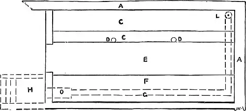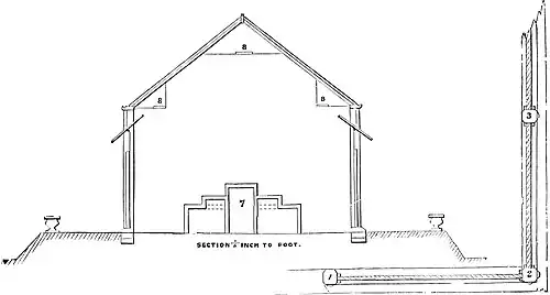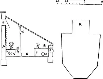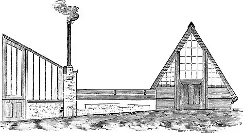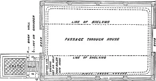 A. Entrance to lean-to. B. Entrance to Paxtonian. C. Boiler.