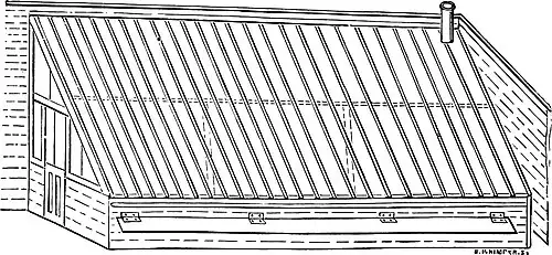 the foot. These bars may be had ready grooved and planed at any of the steam saw and planing mills, and the purling, posts, wall-plate, boards to fix over the ventilators, &c., may also be bought ready for use, so that any ordinary carpenter or clever labourer may build such a house, and if a corner by the garden-wall can be spared it may be done for a small sum.