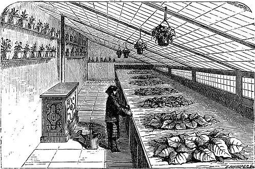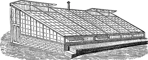 the base; the roof ridge eight feet from the floor. There is an open space of two inches width for ventilation along the top line of the side lights, concealed by the zinc spouting, and another similar space along the ridge. Both these can be opened and closed at pleasure. The door panels and glass over door are on hinges, so as also to serve for ventilation. The interior is fitted with shelves two and a half feet wide. The house is heated from a boiler, which only holds a gallon of water, placed a foot deep below the surface of the soil. The hot-water pipes are two inches in diameter. The flue is a four-inch galvanized iron pipe; the fuel used is coke broken small. The cost of the house and its fittings was £25. Mr. Lant says that he has tested its portability, for he once removed it on a railway truck a distance of sixty miles. “We put three spokes under the base of the house on each side six spokes in all, and two men at each spoke carried it to the railway truck, and thence to its new site, in perfect safety and without drawing a nail. The house and twelve dozen plants were carried in perfect safety a distance of sixty miles on the North-Eastern Railway for 25s.”