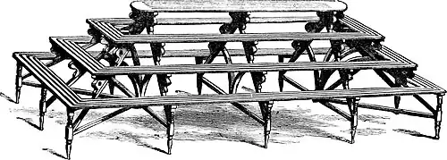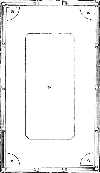must have screws (Fig. 9b), commonly known as bed-screws, put through the top and bottom into the ridge-tree and rafter-plate. The rafters and studs must likewise be secured by these screws, as at Figs. 11—4. In the section, Figs. 1, 2, and 3, show the door stud, the angle stud, and one of the side studs, which are all of one size, the difference consisting only in the putting on of splines and mouldings. The end gable lights may be fixed in their places by means of splines, in the same manner as the side sashes. In the same section, Fig. 8 represents light iron rods suspended from the rafters, as bearers of light shelves, for the accommodation of bedding plants, or other small things which require a situation near the glass. Referring to the ground plan (9, 9, 9, 9) are boxes placed in the angles, in which may be planted climbers, to train over the roof or sides of the building. Fig. 7, stage, which must be strong enough to bear the plants, but may be made in parts, so that it can be removed without having to be knocked to pieces. It will be necessary, in order to protect the building from damp and the liability to settle down, to place it upon some firm and solid matter let into the ground, as brick piers or wood blocks. A platform of bricks laid on the surface, gives a firm and lasting foundation, provided the subsoil has not been recently disturbed.