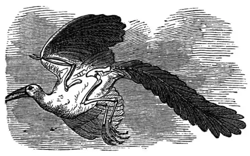 ARCHÆOPTERYX (Gr. ἀρχαῖος, ancient, and πτέρυξ, wing), the name given by Owen to the recently discovered long-tailed or reptilian bird of Solenhofen, one of the connecting links between the reptile and the bird, which made its appearance, as far as known, during the oolitic epoch of the Jurassic period. In the mesozoic age, not only the mammals but the birds had reptilian characters, and the earliest birds had long vertebrated tails. The tail in A. macrurus (Owen) was 11 inches long and 31/2 wide; it consisted of 20 vertebræ, with a row of feathers along each side, the feathers being in pairs corresponding to the number of vertebræ, and diverging at an angle of 45°; the last pair extended backward nearly in the axis of the tail, and 31/2 inches beyond it. The wing appears to have had a two-jointed finger, and its breadth was made by feathers as in birds, and not by an expanded membrane as in the pterodactyl and other flying reptiles; the feet were also like those of birds, and its body was covered with feathers. As we know comparatively little of the terrestrial reptiles of the triassic or preceding period of the mesozoic age, and very little of its bird-like forms beyond that afforded by the footprints in the Connecticut valley, it is expected by naturalists friendly to the doctrine of evolution that future researches will reveal birds more reptilian than the archæopteryx, and bird-like reptiles, which will go far toward filling the gap which now exists between reptiles and birds.