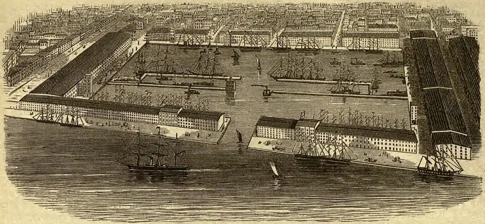 Fronting Governor's island, near the S. extremity of the shore line, stands the massive Atlantic dock, built by a company incorporated in 1840 with a capital of $1,000,000. The basin is a parallelogram in form, has an area of 40 acres with a depth of 25 ft., and will accommodate the largest vessels; 500 vessels can occupy it at the same time, and 400 canal boats besides many other vessels have floated upon it at once. The pier line on Buttermilk channel is 3,000 ft. long; the total wharfage is about 2 m. Surrounding the basin on all sides, excepting an entrance 200 ft. wide for vessels, are substantial brick and granite warehouses, from two to five stories high, and covering an area of 20 acres. Grain is the chief article stored here, for the reception of which nine steam elevators are employed, the largest of which will raise 8,000 bushels per hour. The value of merchandise stored annually in the warehouses of this company and those south of them to Red Hook point is estimated as follows: