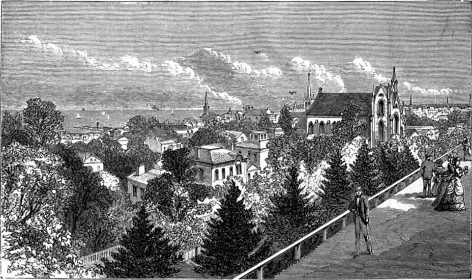 Cleveland contains 6 national banks, with an aggregate capital of $4,300,000, 2 savings banks, and 9 insurance companies (2 life), with a capital of $1,950,000. There are 31 hotels and 3 markets.—The city is divided into 17 wards, and is governed by a mayor and common council of two members from each ward. There are also a clerk, who is likewise clerk of the common council, an auditor, a treasurer, a solicitor, a street commissioner, a civil engineer, and a superintendent of markets. The board of improvements consists of the mayor, street commissioner, engineer, a clerk, and two other members; the board of health is composed of the mayor, health officer, and six others. The United States circuit and district courts for the northern district of Ohio are held here; also the state district court, the court of common pleas, a probate and a police court. The board of metropolitan police consists of the mayor, a secretary, and a superintendent. The city is divided into 5 precincts, and the force, besides the privates, is composed of a captain, 6 sergeants, 3 acting sergeants, 3 detectives, and 3 special detectives. The fire department is under the control of a chief engineer and 2 assistants. There are 7 steam engines, 2 hook and ladder companies, and a fire alarm telegraph, under the charge of a superintendent. The assessed value of property in 1870 was $51,841,746.—There are several well conducted reformatory and charitable institutions. The house of correction is under the charge of a board of directors. The city infirmary, to which the sick and homeless poor are taken, has attached to it a good farm, which is worked by the inmates of the institution. Connected with the infirmary is a house of refuge for children, where they are instructed and taken care of until of an age to maintain themselves. St. Vincent's male orphan asylum contains 150 orphans under the charge of the sisters of charity, and St. Mary's female orphan asylum, under the charge of the ladies of the Sacred Heart of Mary, has 160 inmates. The “little sisters of the poor” provide for 70 aged men and women. The Cleveland orphan asylum is supported by voluntary contributions, and by an endowment fund of about $54,000. The Episcopalians have a home for sick and friendless widows, and the Jews support an orphan asylum. A United States marine hospital has been established here, and is situated on the border of the lake. The charity hospital, established partly by the city and partly by subscriptions, is attended by the sisters of charity. There are also a homœopathic hospital and a city hospital. In the industrial school poor and homeless children are provided with food and shelter, and are taught the common branches of education, sewing, domestic labor, and brush making. The public schools are under the control of a superintendent and a board of education of one member from each ward, and consist of 2 high schools and 16 grammar and primary schools. The average attendance of pupils in 1871 was 8,175, of whom 4,133 were males and 4,042 females, the number of teachers was 187, of whom 9 were males; the receipts were $145,049 67 from taxation, and $48,457 69 from the state fund; expenditures, $143,700 95, of which $118,655 were for teachers' wages and $27,880 69 for sites and buildings. The Cleveland female seminary had 13 instructors, 100 pupils, and a library of 1,000 volumes; the Union business college had 6 teachers and 448 pupils. There are two German and English schools, 7 other seminaries and schools belonging to Protestant societies, 11 Roman Catholic academies and schools, and 6 private and select schools. The Ohio State and Union law college in 1871 had 2 professors, 28 students, and a library of 2,500 volumes. The Cleveland medical college (medical department of the Western Reserve college at Hudson) and the medical department of the university of Wooster are situated here. The homœopathic hospital college, founded in 1849, which admits females, in 1871 had 17 professors, 86 students, and a library of 2,000 volumes. St. Mary's ecclesiastical seminary (Roman Catholic) has 3 professors and 25 students. The Western Reserve historical society has its seat here. The Cleveland library association have a reading room and a library of 12,000 or 15,000 volumes. The public library, opened in 1869, contains about 8,500 volumes. There are 6 daily newspapers (1 German), 3 tri-weekly, 1 semi-weekly (German), 10 weekly (2 German and 1 Bohemian), and 1 semi-monthly and 7 monthly periodicals. The principal place for dramatic entertainments is the academy of music, besides which there are a Bohemian theatre, a German theatre, a theatre comique, and various other public halls for lectures, &c. The freemasons have 2 halls and 13 lodges, chapters, &c., of which 1 is for Germans; the odd fellows have a hall, 2 encampments, and 10 lodges (2 German). There are 10 temperance societies, and 25 lodges, &c., of other orders. The city contains 88 churches, divided as follows: 7 Baptist (1 German and 1 colored), 1 Bible Christian, 13 Roman Catholic (1 Bohemian, 1 French, and 4 German), 1 Christian, 5 Congregational (1 colored), 1 Disciples', 2 Evangelical (German), 4 Evangelical Association (3 German), 2 Evangelical Lutheran (German), 2 Evangelical Protestant (1 German), 1 Free Will Baptist, 1 Friends', 2 Jewish, 15 Methodist (2 German and 1 colored), 7 Presbyterian, 11 Episoopal, 4 Reformed (3 German), 1 Spiritualist, 1 Swedenborgian, 1 Unitarian, 3 United Evangelical (1 German), 1 United Brethren (German), 1 Universalist, and 1 miscellaneous. There are a young men's Christian association, a women's Christian association, 2 convents, and 2 other Catholic religious associations.—Cleveland was laid out in 1796, and was named in honor of Gen. Moses Cleaveland, a native of Connecticut, under whose charge the first surveys in what is known as the Western Reserve were made. It was until 1806 confined to the E. shore of the Cuyahoga, and was an 