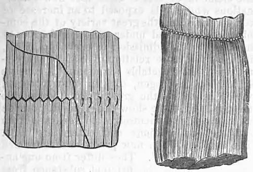 The sigillaria species differ essentially from the lepidodendron by the position of the scars, which are placed in vertical rows separated by convex or flat ribs, and generally at a distance from each other. The form of these scars is extremely variable, and, as in lepidodendron, their size enlarges in proportion to the growth of the trees. The identification of the species is therefore very difficult, especially when it has to be made, as is generally the case, from fragmentary specimens. It is rendered still more embarrassing by the fact that the bark of some species of sigillaria is composed of different thin layers, easily separated, on which the leaf scars, though superposed, differ upon each layer. The club mosses of our time rarely have stems half an inch in diameter; those of the coal, or the lepidodendron and sigillaria, were represented by trees sometimes 2 ft. in diameter and 40 to 60 ft. high.