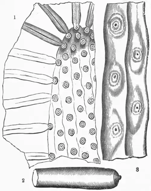 Fig. 8.—1. Stigmaria with leaves. 2. Stem of Stigmaria with scars. 3. Leaf of Stigmaria.